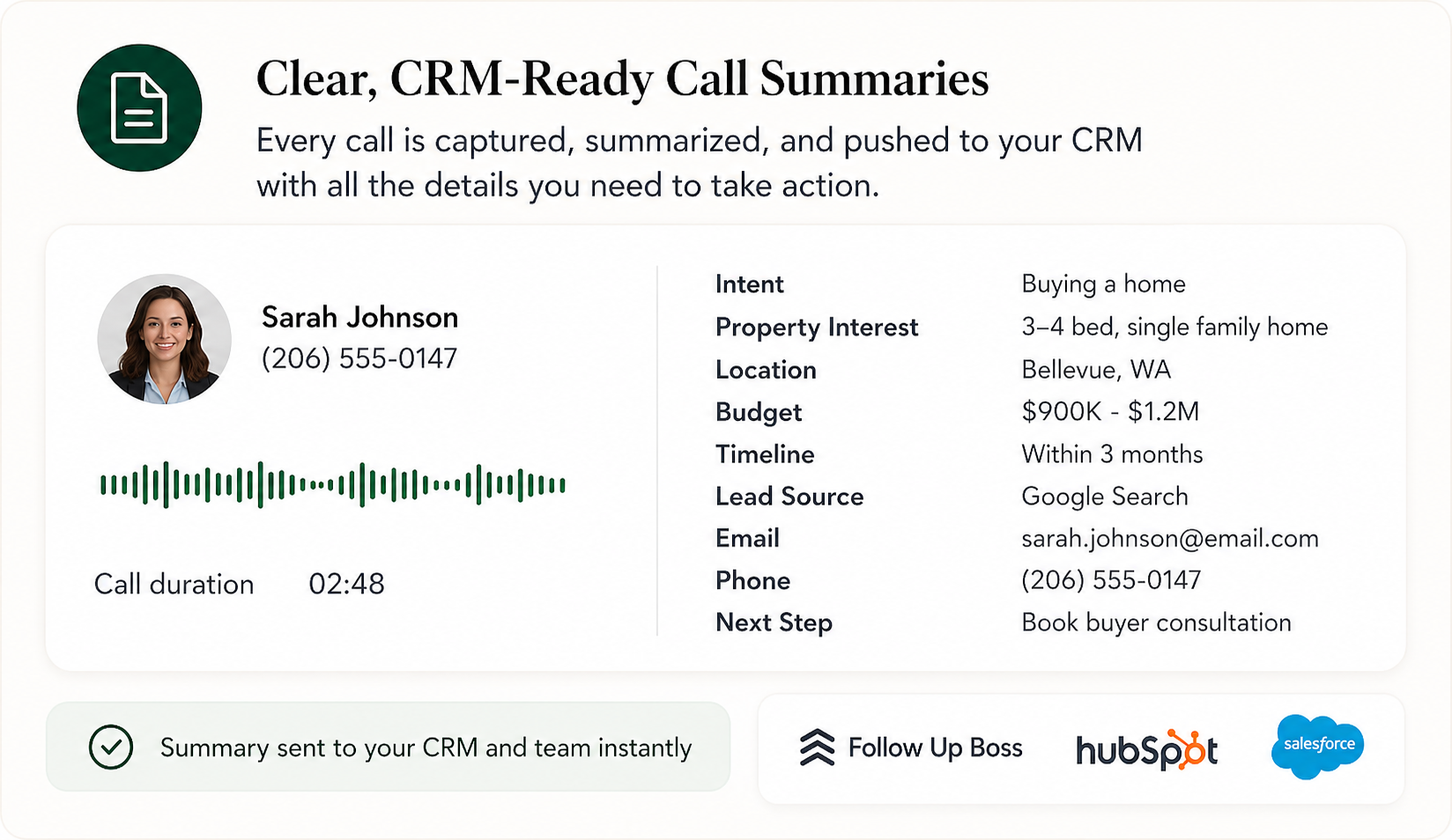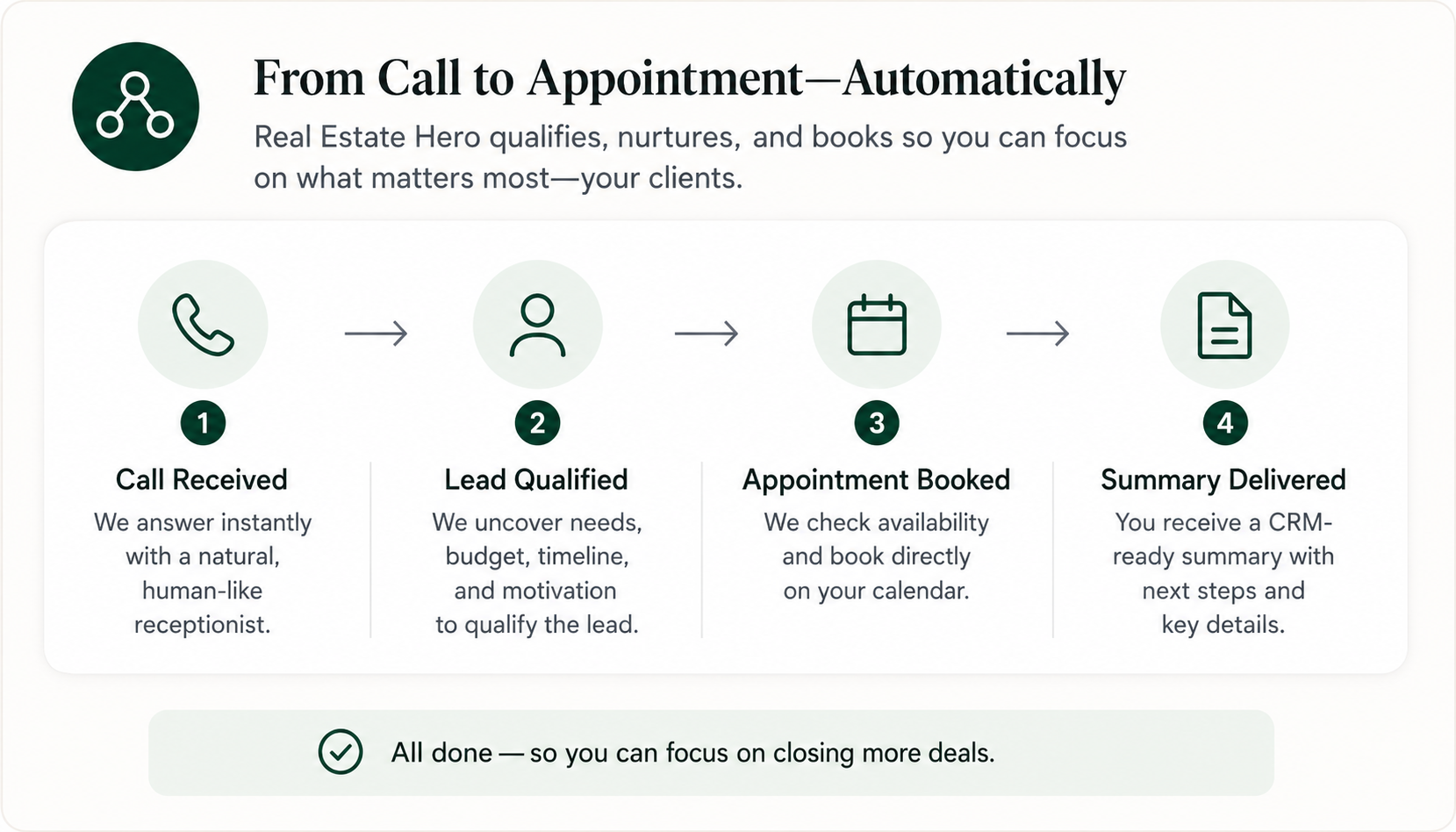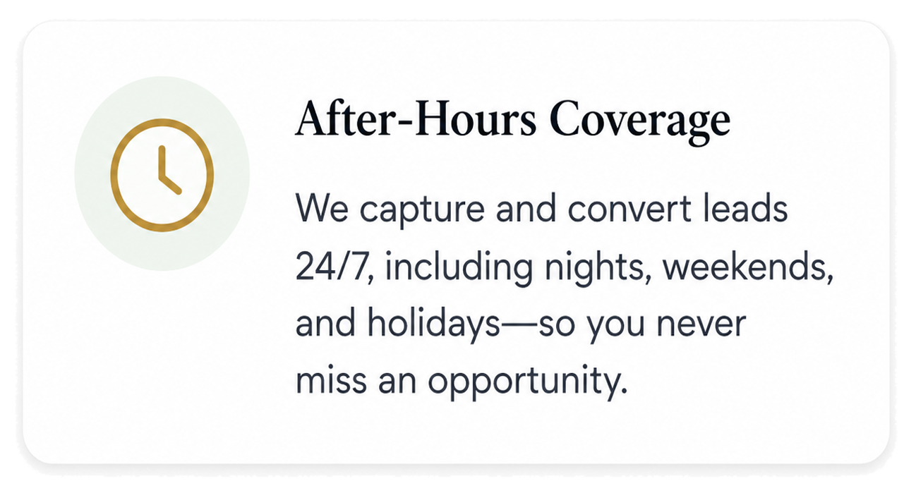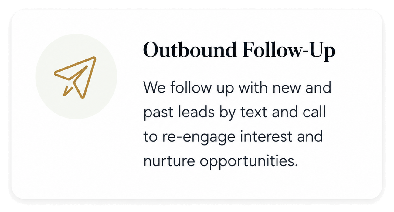 Our AI receptionist manages every call, qualifies leads, books appointments, follows up automatically, and integrates with your existing CRM. No tech knowledge required.